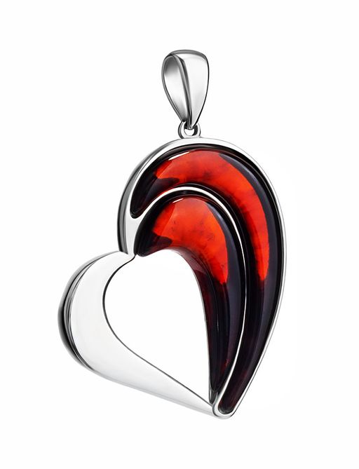 • Стилизованный кулон-сердце из серебра и вишнёвого янтаря Санрайз