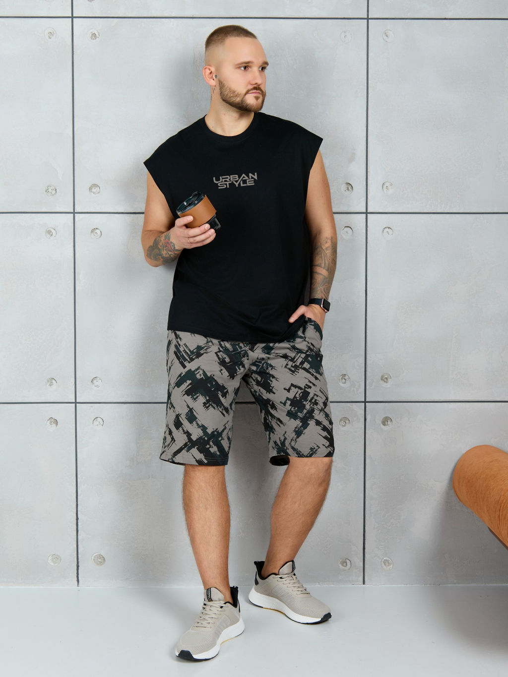 Костюм мужской, состоящий из майки и шорт. Майка однотонная с принтом на груди; модель свободная, со спущенной линией плеч и углубленной проймой. Шорты из полотна с набивным рисунком эксклюзивного дизайна, с боковыми карманами с обтачными входами, на притачном поясе с отстроченной эластичной тесьмой.­