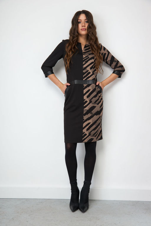 Состав: Платье: Вискоза-60%; ПЭ-36%; Спандекс-4%; Платье: Вискоза-26%; ПЭ-70%; Эластан-4%; Отделка: ПЭ-40%; ПУ-60%; Платье прилегающего силуэта. По центральной части переда расположен вертикальный шов, соединяющий две ткани с разным принтом. Шов у горловины заканчивается разрезом, глубиной 8 см. Верхняя и нижняя часть изделия разделена декоративным отделочным поясом, расположенным на заниженном уровне талии. Платье имеет наклонные функциональные карманы с отделочной планкой. Лиф изделия состоит из рельефных деталей-для прилегания. Длина лифа по полочке до отделочного пояса-46 см. Спинка платья состоит из двух также контрастных принтов, соединенных по центральному шву отделочной вертикальной контрастной планкой, в которой расположена скрытая застежка-молния. Внизу данная планка заканчивается открытым разрезом 18 см. также на спинке платья имеются талиевые вытачки для прилегания. Рукав облегающий, с притачной отделочной манжетой, шириной 3.5 см. Обхват манжеты в р.44-25 см, в р.50-28 см. Длина рукава в готовом виде-44.5 см. Длина платья-102 см. Особые рекомендации: рекомендуется холодная деликатная ручная стирка, без использования отбеливающих СМС, без интенсивного трения. Сушка в вертикальном положении. ВТО с минимальным паром. -- Характеристики -- Состав: Платье- Вискоза-60%; ПЭ-36%; Спандекс-4%; Платье- Вискоза-26%; ПЭ-70%; Эластан-4%; Отделка- ПЭ-40%; ПУ-60%; Сезон: Осень-Зима Рост: 164 Страна бренда: Беларусь