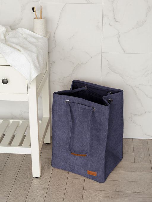 Корзина для белья DeNASTIA вельвет NEW, 35x30x50 см, синий. Мягкая корзина для хранения белья, выполнена из вельвета и удобна в использовании. В пустом виде бак для одежды практически не занимает места. Когда все вещи отправлены в стирку, корзину можно сложить и на время убрать из ванной. От хранения в компактном виде её внешний вид не пострадает. Такая корзина для вещей не занимает много места, она будет увеличиваться в объёме по мере заполнения бельём, а максимальный объём корзины - 52,5 л. Размер корзины: высота 50 см, длина 35 см, ширина 30 см.