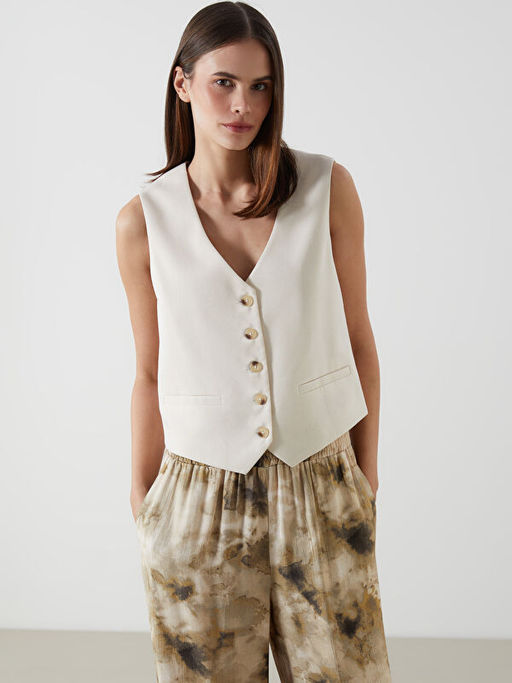 • V Yaka Keten Kar???ml? Kad?n Klasik Yelek