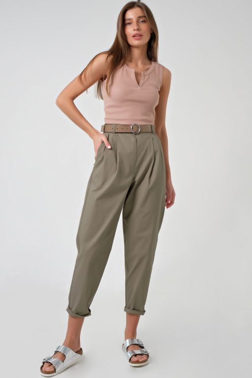 Особенности: Брюки из костюмной ткани. Детали: широкие по бедрам и зауженные к низу, притачной пояс со шлевками и застежкой на пуговицу, боковые карманы, защипы по переду, кокетка по спинке, застежка на молнию.
