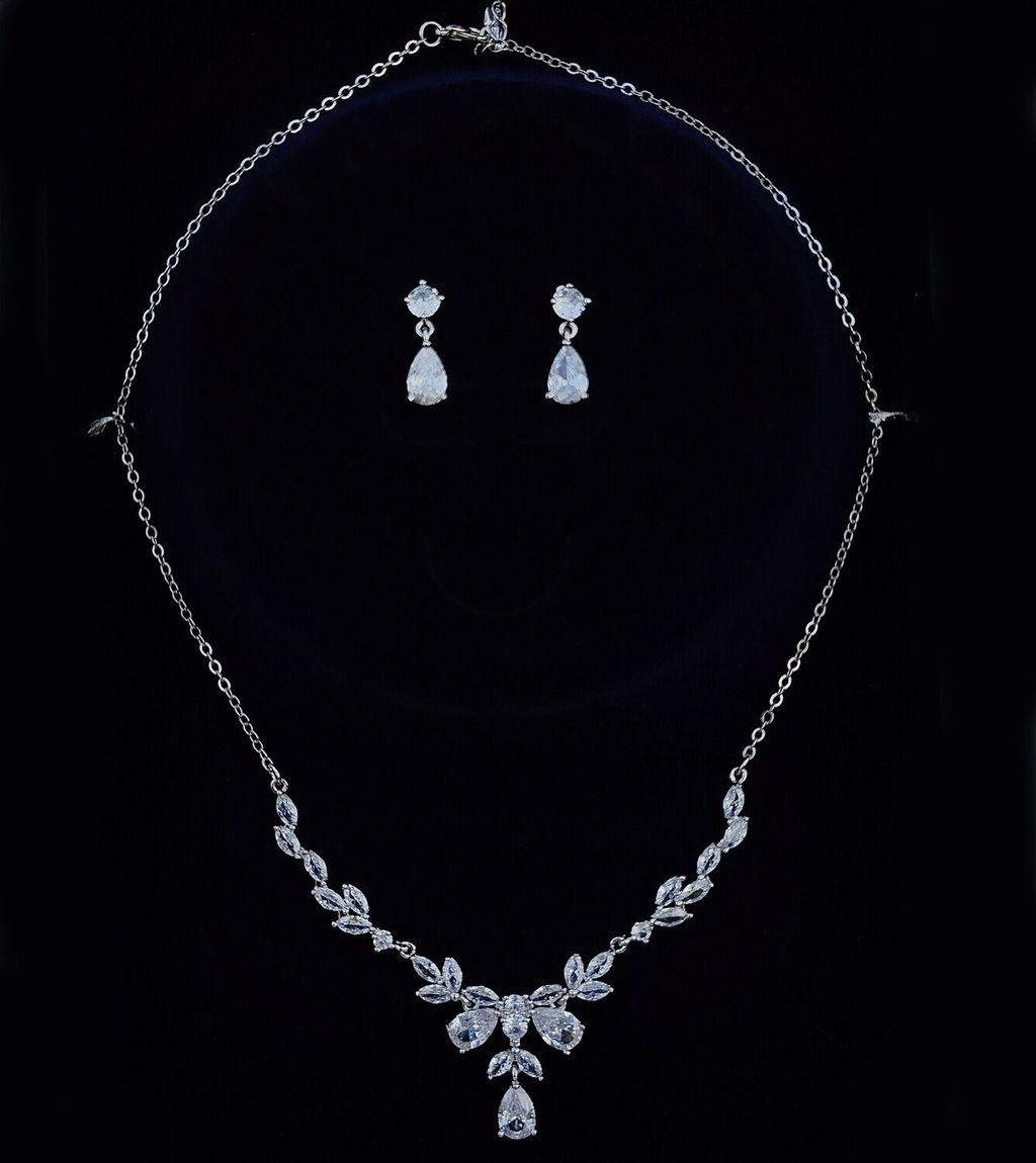Изготовлен из ювелирного сплава покрытого родием. Металл не тускнеет и не стирается со временем. Изделие гипоаллергенно . Длина колье без удлинения - 42 см, удлинитель - 5,5 см. Длина серег - 2 см.­