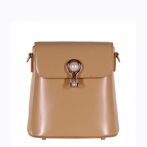 Эффектная  модель, выполнена из глянцевой натуральной кожи. Декорирована пряжкой с жемчужинкой на передней части. Дополнена золотистой фурнитурой. Данная модель закрывается на клапан. Каркас жесткий. В комплекте съемный ремень  регулируется по длине, крепится за карабины и съемная короткая ручка.