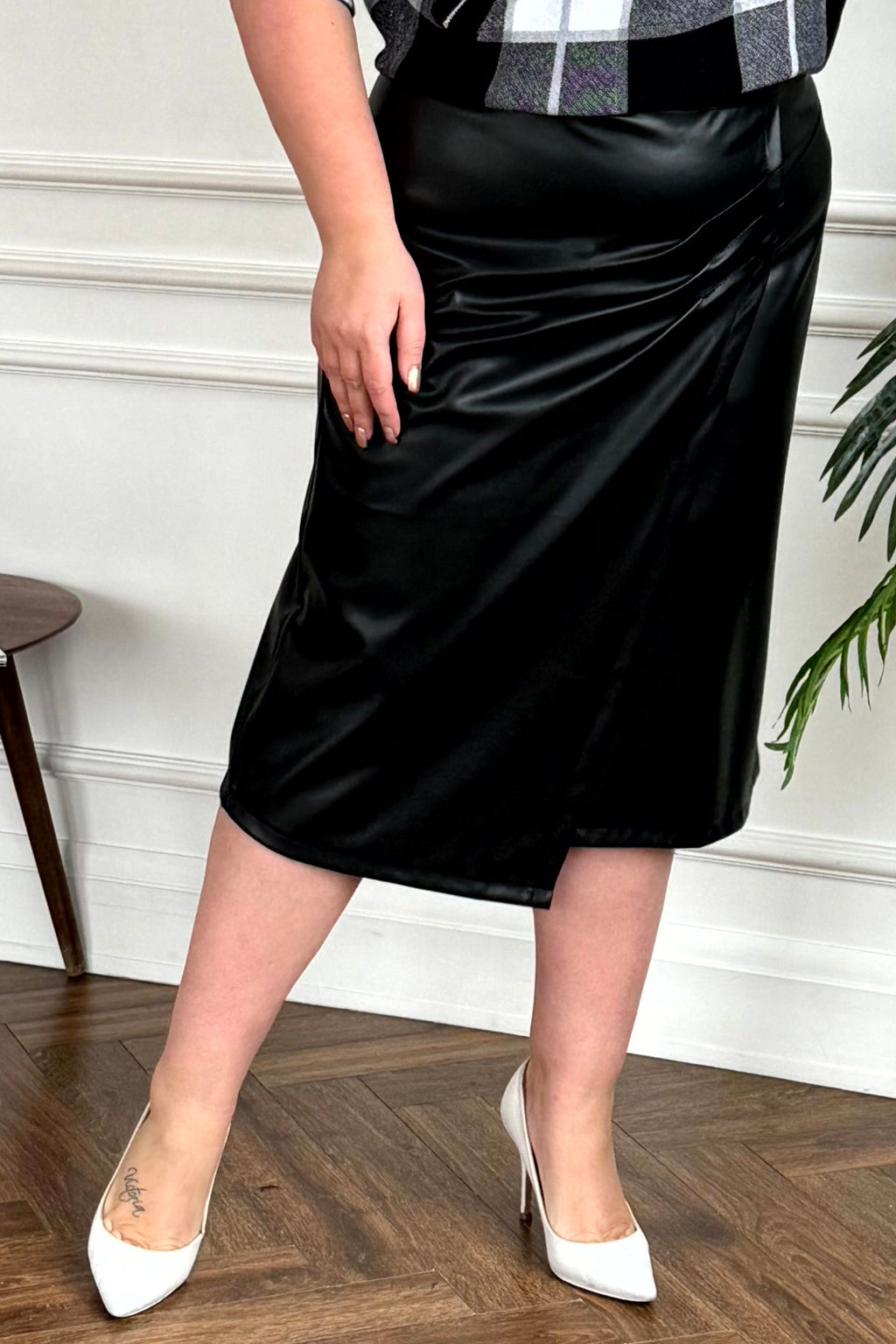 Юбка с косым запахом кожаная черная