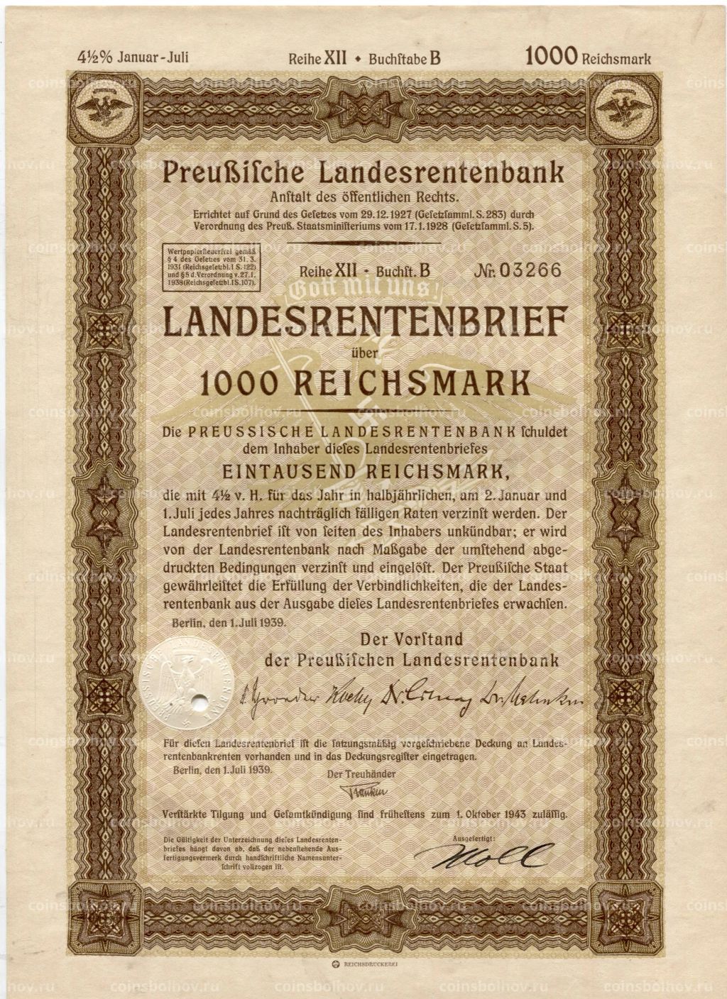 • Облигация 4,5% 1000 рейхсмарок 1939 года Германия