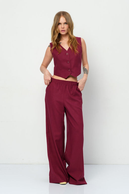Льняной костюм-двойка из укороченного жилета и широких брюк на резинке.