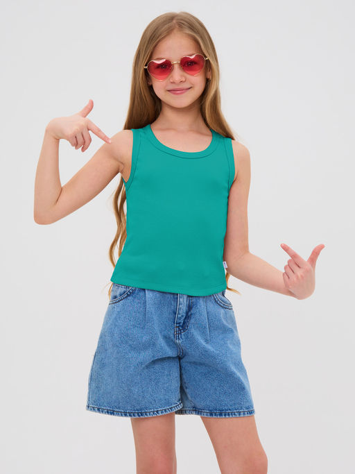 Майка для девочки из кашкорсе, облегающего силуэта чуть ниже талии. Состав:92% хлопок, 8% лайкра