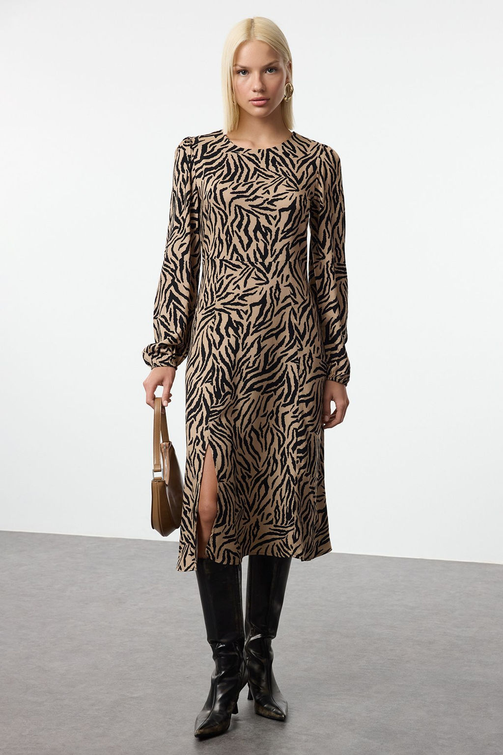 • Kahverengi Cicekli Midi Dokuma Elbise TWOAW23EL00325