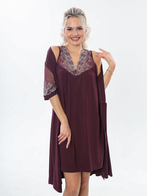 Кружевной трикотажный пеньюар - идеальный выбор для комфортного и элегантного отдыха дома. Изготовлен из высококачественной вискозы. Сорочка длинною до колена, вверх изделия украшен изысканным кружевом на сетке премиум качества. Халат, длиной за колено, с запахом, короткие рукава из сетки с кружевом добавляют нотку романтики и женственности. Модель пеньюара подходит для женщин с большими размерами и беременным, благодаря отличной тянущейся вискозе, которая обеспечивает идеальное прилегание и свободу движений. Простота и лаконичность дизайна этого комплекта прекрасно сочетаются с изысканностью и стилем, делая его незаменимым атрибутом вашего гардероба для специальных моментов отдыха или для повседневного использования.