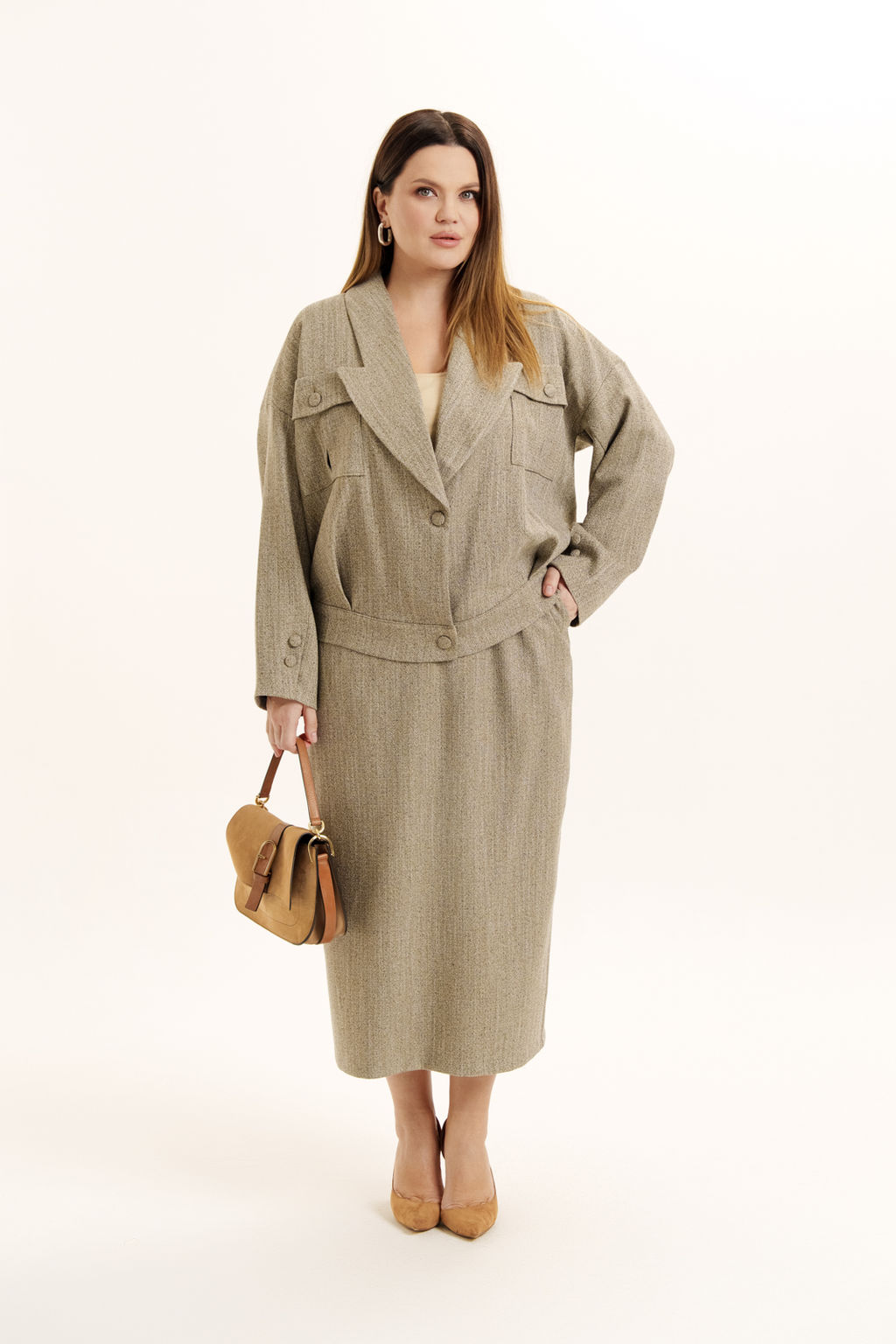 Комплект женский двухпредметный из смесовой ткани. Жакет свободного покроя. Вырез горловины - пиджачного типа фантазийной формы. Застежка - однобортная на петли с пуговицами. Рукава - втачные со спущенной линией плеча. Внизу рукавов - имитация шлиц с пуговицами. Спереди выполнены накладные карманы со складкой и клапаном. По низу изделия - отрезной пояс с мягкими складками для объема. Изделие посажено на подкладку. Юбка - зауженная к низу со шлицой на спинке. Пояс- отрезной с эластичной тесьмой и застежкой на петлю с пуговицей. в боковых швах имеются карманы с отрезными бочками. Юбка декорирована поясом в виде шнурка из основной ткани. Изделие посажено на подкладку.