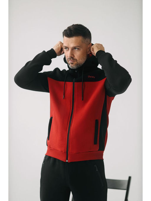Верх — толстовка на молнии с высоким капюшоном. Отрезная кокетка и контрастная вставка по передней части создают динамичный и современный образ. Удобные боковые карманы на молнии с листочками надёжно защищают содержимое. Рукава и низ изделия на манжете, что обеспечивает плотную посадку и комфорт при движении.