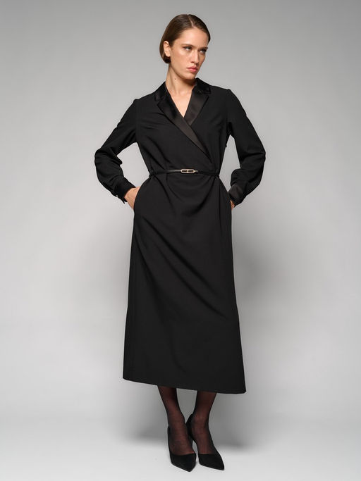 Женское платье-футляр черного цвета. Модель с длинными рукавами, вырезом на запах и длинной юбкой, обнажающей щиколотки. В комплекте идет пояс-цепочка для подчеркивания талии. Платье можно носить  с лодочками или босоножками. Для усиления образа дополните платье аксессуарами от ELEGANZZA.