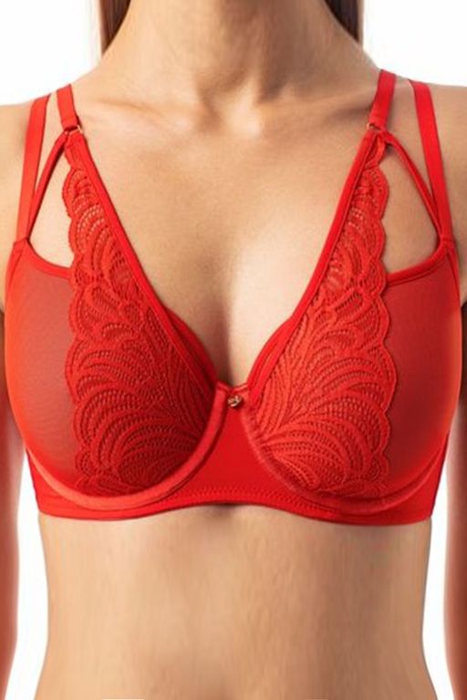 Бюстгальтер на каркасах с бесшовными формованными чашками из 3D материала Spacer (Спейсер). Под термином Spacer понимается очень легкий и дышащий материал, приятный на ощупь, прекрасно держащий форму. Чашки обтянуты эластичным сеткой и спереди чашка украшена элементами в виде крыльев из кружева.  Украшение металлический медальон с логотипом COQUETTE REVUE.­