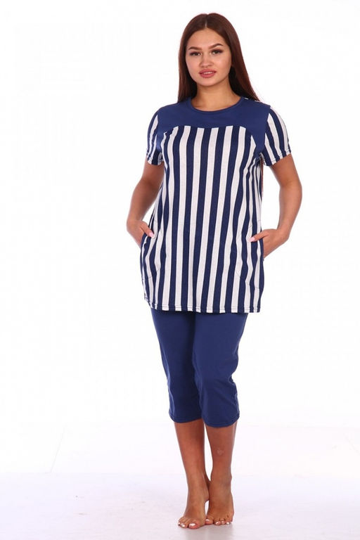 Женский костюм с бриджами полуприталенного силуэта. Длина бридж ниже колена. Кокеткка на футболке в тон с бриджами. Футболка с коротким рукавом и карманами.