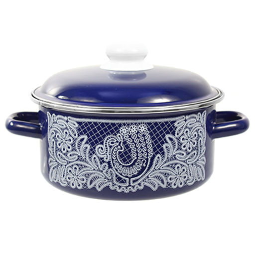 • "Вологодское кружево" Кастрюля эмалированная 3л, д22см, h10,5см, цилиндрическая форма, металлическая крышка с пластмассовой ручкой-кнопкой, ободок из нержавеющей стали, синий (Россия)