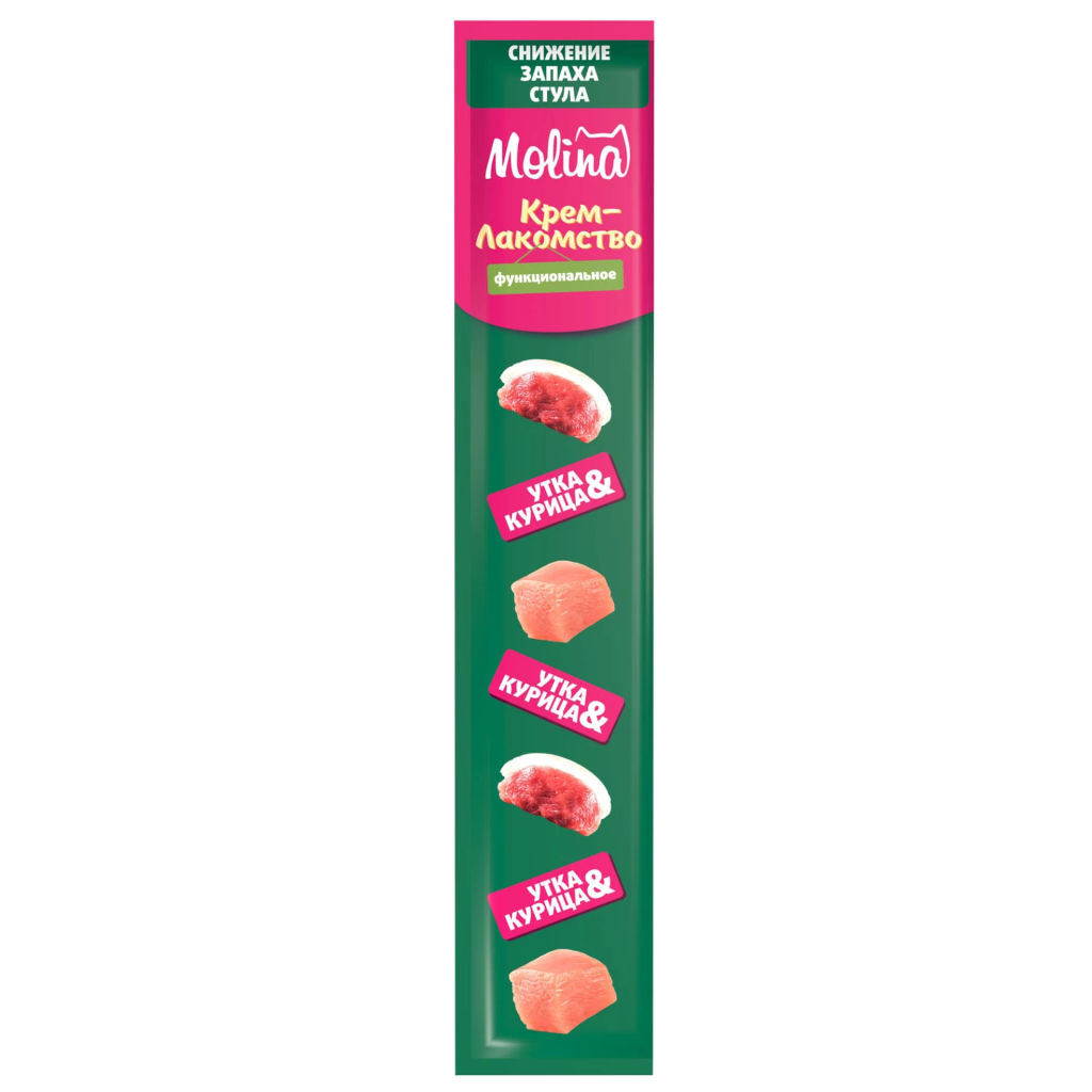 Molina Creamy Treats. Odor reduction. Функциональное крем-лакомство с уткой и курицей для котят и взрослых кошек. Снижение запаха фекалий.
