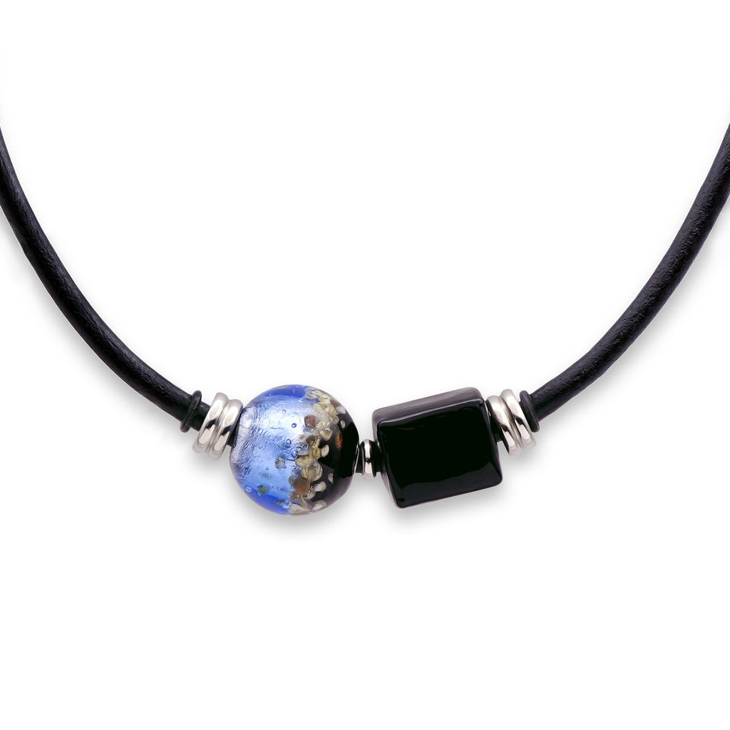 Колье изготовлено из натуральной кожи, муранского стекла и гипоаллергенной ювелирной стали, что очень важно для людей с чувствительной кожей. Металл не темнеет и не подвергается воздействиям окружающей среды, надолго обеспечивая красивый внешний вид изделия. Длина колье - 46 см + 5 см. удлиняющая цепочка. Диаметр стеклянного шара - 2,2 см. Размер куба - 1,8х1,6 см. Вес - 41 гр.­
