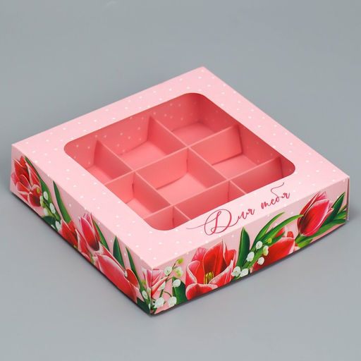 Цена за 5 шт. Коробка для конфет, кондитерская упаковка, 9 ячеек, «Тюльпаны», 14.7×14.7×3.5 см