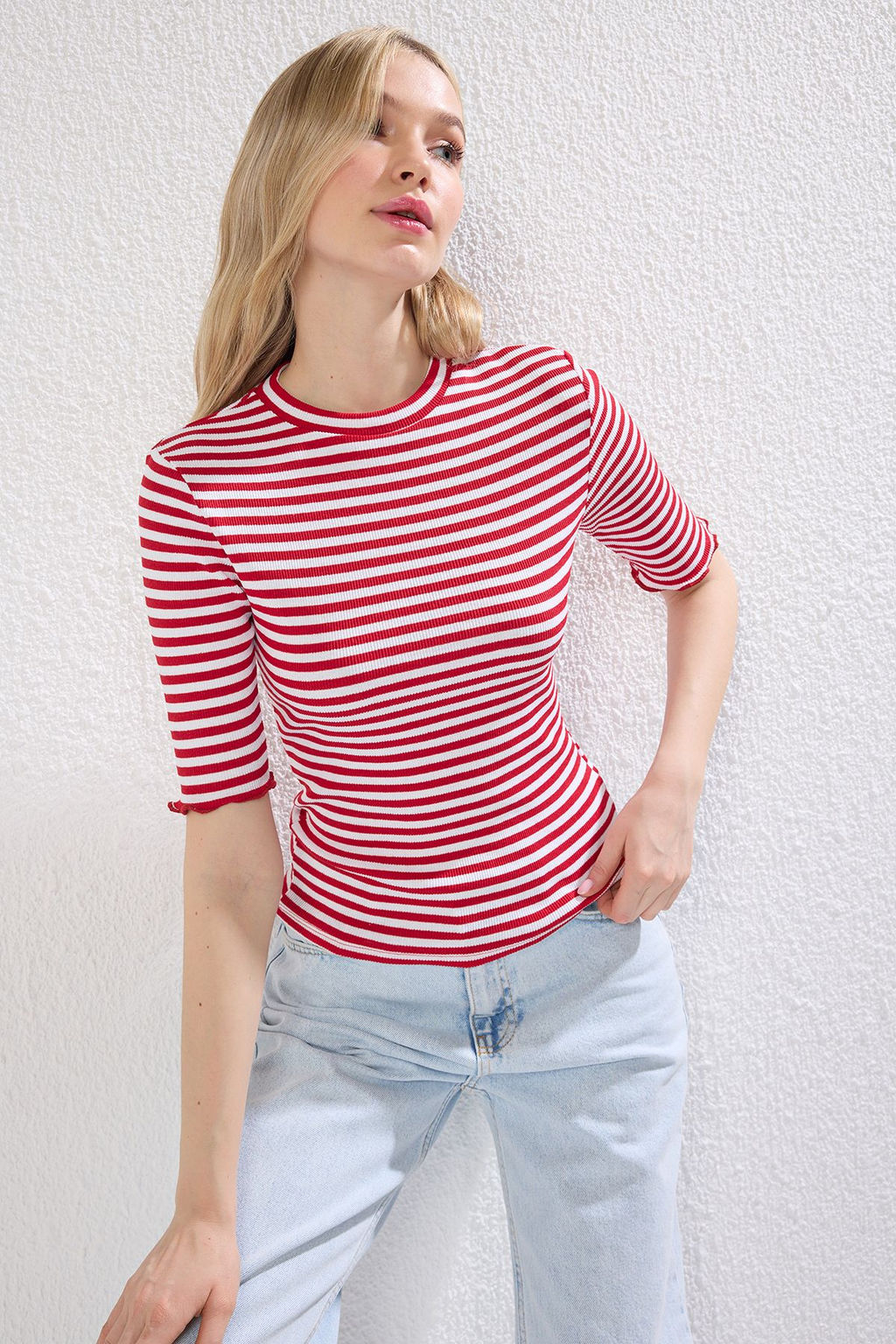 K?rm?z?-Ekru cizgili Fitilli Fitted/Vucuda Oturan Bisiklet Yaka Esnek Orme Bluz TWOSS23BZ00025