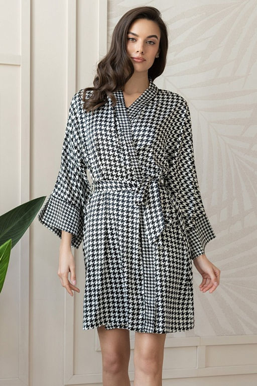 Короткий халат-кимоно Mia-Amore с широким рукавом длиной 3/4 . Халат выполнен из смесового шелка. В изделии используются два вида масштаба одного принта, граница которых разделена контрастным кантом. По бокам обработаны карманы.­