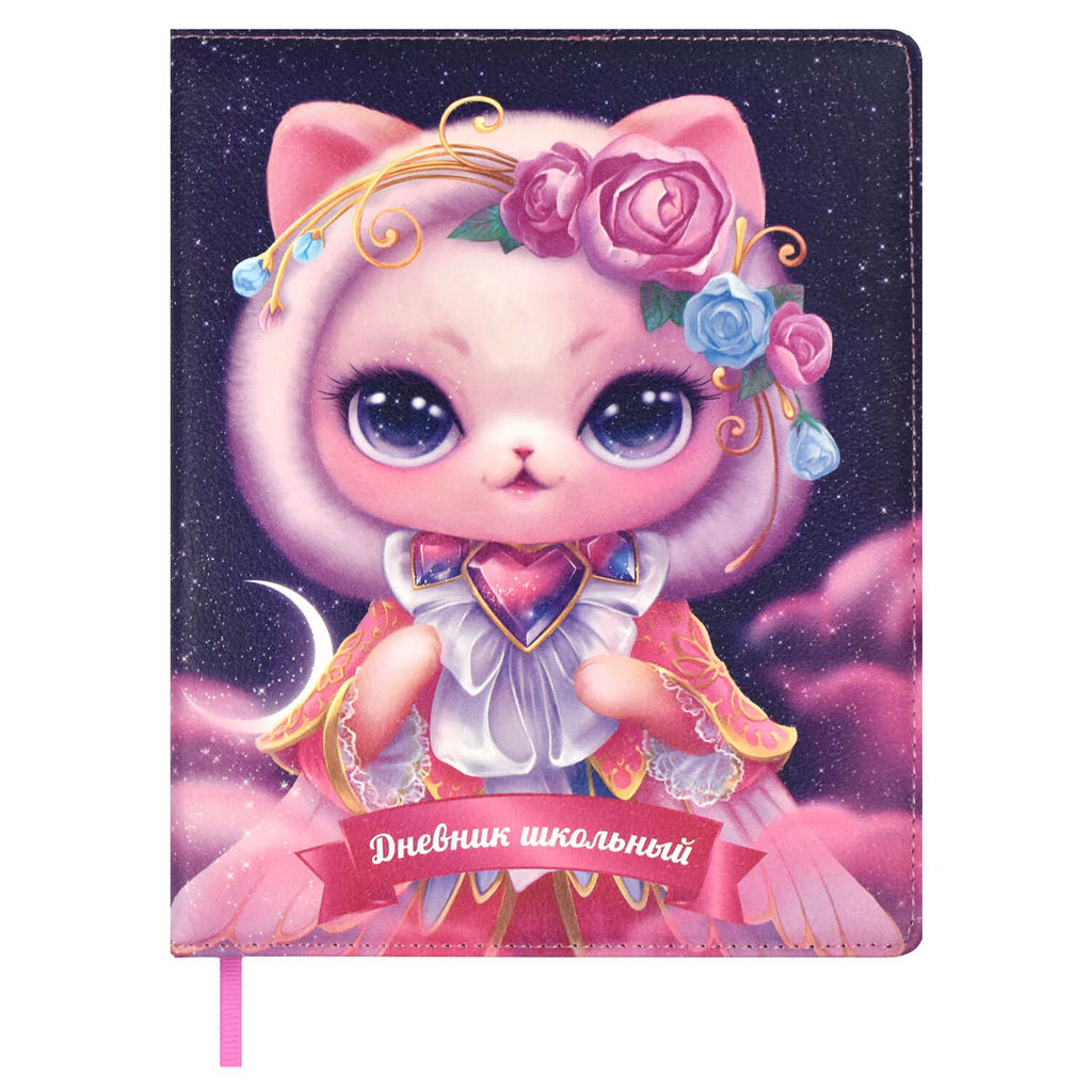 Дневник школьный арт. 66386 / 15 КОШКА-ПРИНЦЕССА (кожзам: А5+; твёрдый переплёт с поролоном, материал обложки: искусственная кожа "Наппа"; декор: полноцветная печать; способ крепления блока: ниткошвейный; вн. блок: 48 л., белый офсет 80 г/м?, печать в одну краску, справочный материал: универсальная шпаргалка; закладка: одно ляссе; форзац: печать в одну краску; индивидуальная упаковка: ПЭТ-пакет)