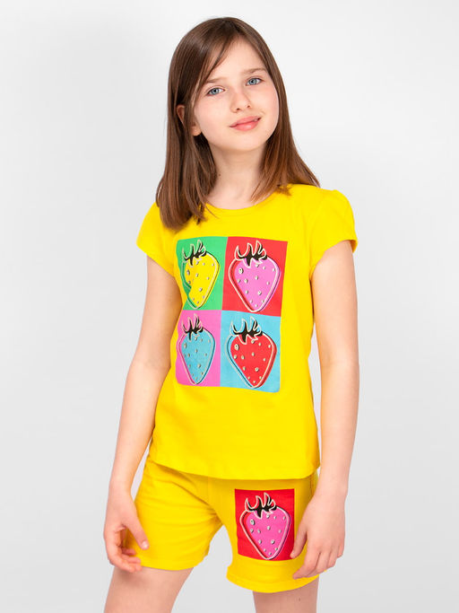 Цвет: желтый Бренд: Bonito Пол: Девочки Производитель: Узбекистан Сезон: лето Тип ткани: Кулирка Категория: Костюм летний Тип рукава: Короткий Комплектация: 1 футболка, 1 шорты Уход за вещью: Максимальная температура стирки 40С Страна бренда: Узбекистан Состав материала: 100% хлопок Замеры модели* * рост указан приблизительно, ориентируйтесь на замеры * Размер 104 (рост 98-104 см) длина футболки 38 см, обхват груди 54 см, длина шорт 22 см, обхват талии 40 см. * Размер 110 (рост 104-110 см) длина футболки 40 см, обхват груди 56 см, длина шорт 25 см, обхват талии 42 см. * Размер 116 (рост 110-116 см) длина футболки 44 см, обхват груди 58 см, длина шорт 27 см, обхват талии 44 см. * Размер 122 (рост 116-122 см) длина футболки 45 см, обхват груди 62 см, длина шорт 28 см, обхват талии 46 см. * Размер 128 (рост 122-128 см) длина футболки 48 см, обхват груди 64 см, длина шорт 30 см, обхват талии 48 см. Яркий костюм, декорированный оригинальным принтом, для девочки. Легкий трикотажный материал-кулирка отлично пропускает воздух и впитывает влагу. Удобный и практичный вариант для дома или прогулки в теплое время года.
