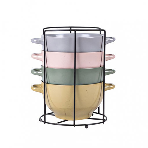 Набор из 4-х бульонниц с ручками выполнен из высококачественной керамики. Посуда компактно располагается на оригинальной металлической подставке и не занимает много места при хранении на кухне. Бульонницы подойдут для подачи горячих бульонов, супа, холодца и других блюд.