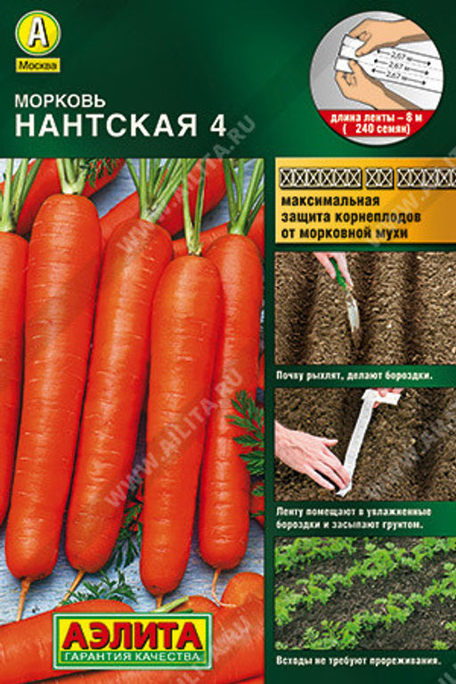 Среднеспелый сорт, от всходов до технической спелости 80-100 дней. Урожайность высокая 6-7 кг/м2. Корнеплоды с небольшой сердцевиной, выравненные, длиной 15-17 см и массой 95-165 г. Мякоть сочная, нежная, сладкая, с повышенным содержанием каротина. Подходит для длительного хранения и детского питания. Сорт устойчив к цветушности и растрескиванию корнеплодов. С развитием первых двух пар настоящих листочков растения прореживают. Второе прореживание проводят, когда корнеплоды достигнут диаметра 1 см. Возможен подзимний посев (в конце октября начале ноября) на глубину 3 см.