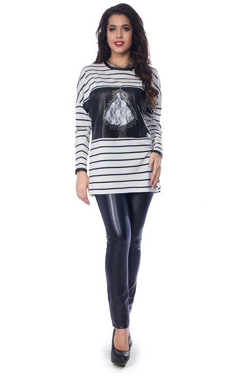 Молодежные брюки прилегающего силуэта синего цвета. Передняя часть брюк выполнена из кожаного полотна, а спинка из однотонного текстиля. Посадка брюк - средняя. Застежка на молнию и крючок сбоку изделия.