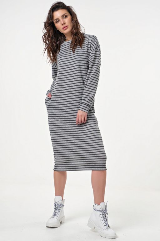 Особенности:Платье из трикотажа в полоску. Детали: горловина округлой формы, спущенный втачной рукав на манжете, карманы в боковых швах.­