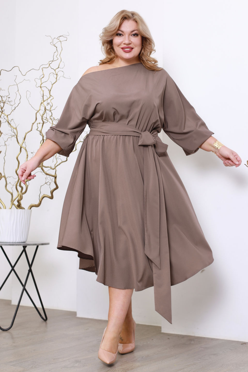 Платье расклешенное с поясом капучино