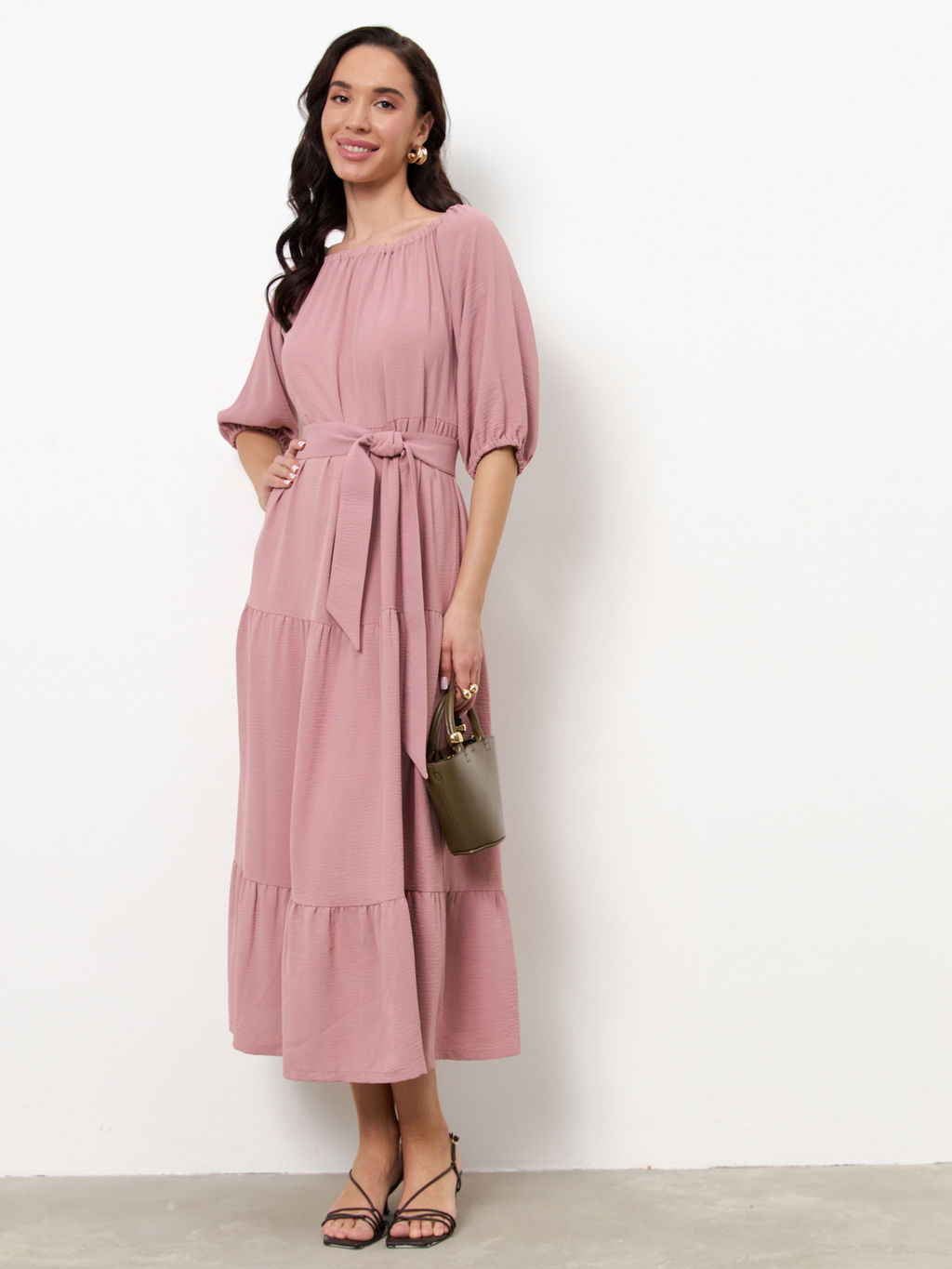 Платье свободного силуэта из ткани с крэш-эффектом, отрезное по линии талии. Нижняя части платья с воланами. Рукав-реглан до локтя. По низу рукава сборка на резину. Линия плеча и линия горловина оформлены сборкой на резину. В комплекте пояс из основной ткани.