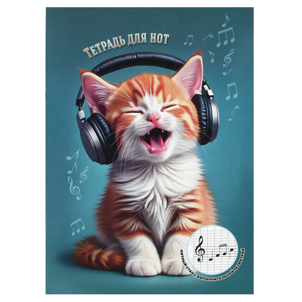 Тетрадь для нот 16 л. арт. 73233 КОТЕНОК ПОЕТ /А4, белый офсет, мягкий переплёт (2 скобы), облож.- мелованная бумага 130 г/м?, вспомогательные линии нотного стана для младшей школы.