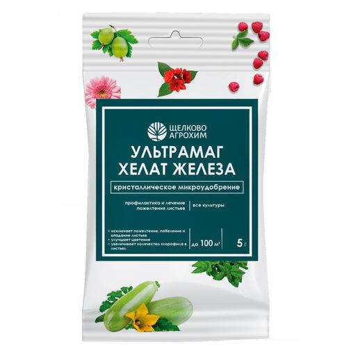 Эффективное водорастворимое удобрение. Применяется в качестве корневой и внекорневой подкормки для плодовых, овощных, ягодных и цветочных культур. Характеристики: * тип: регулятор роста; * назначение: универсальный; * форма выпуска: сухая; * вес: 5г; * в составе: ионы 2-валентного железа Fe(II); * упаковка: цветной пакет с описанием; * срок годности: см. на упаковке. Действие: * увеличивает урожайность; * повышает качественные показатели урожая; * положительно влияет на развитие растений; * частвует в образование тканей, способствует их прочности; * улучшает усвоение других питательных веществ; * участвует в транспорте углеводов из листьев; * быстро растворяется, легко усваивается растениями; * совместим с минеральными удобрениями и ядохимикатами. Применение: * корневая подкормка:5-10г препарата развести в 10л воды, хорошо перемешать. Полученным раствором поливать растения до полного промачивания земляного кома. Подкормку проводить в течение вегетационного периода 1-2 раза с интервалом 10-15 дней. Норма расхода: 1-5л/кв.м; * внекорневая подкормка:2-5г препарата развести в 1л воды, хорошо перемешать. Полученным раствором опрыскивать поверхность листьев до полного смачивания, избегая попадания раствора на цветки и плоды. Подкормку проводить в течение вегетационного периода 1-2 раза с интервалом 10-15 дней. Норма расхода: 1-1,5л/10кв.м.