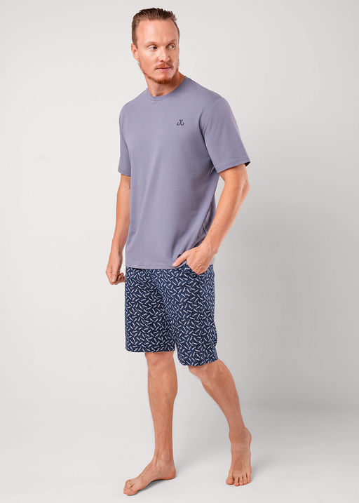 Набор мужской для дома состоящий из футболки и шорт. Футболка из хлопковой кулирной глади с эластаном с круглым вырезом горловины, коротким рукавом и вышивкой. Шорты из набивной кулирной глади на эластичном поясе с функциональными карманами и шнуром. 92% хлопок, 8% эластан