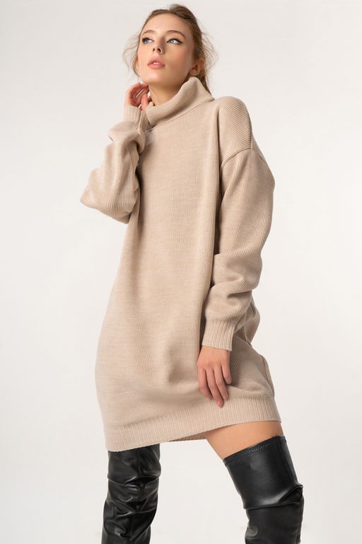 • Платье вязаное теплое с высоким горлом молочный меланж