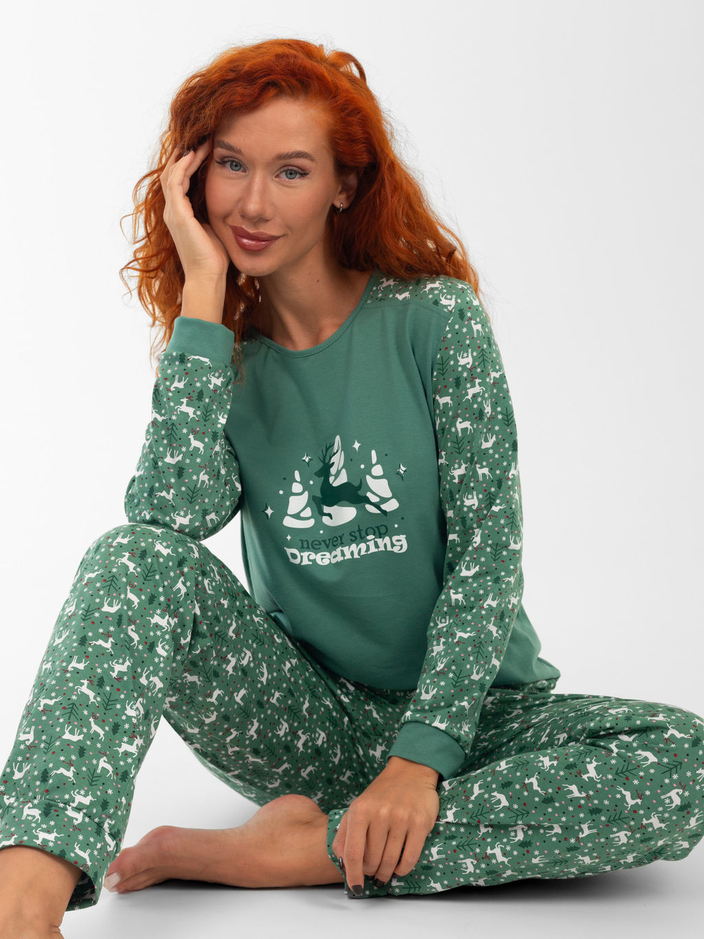 • Пижама женская кулирка с брюками "ЗИМНИЙ ЛЕС" ЗЕЛЕНЬ