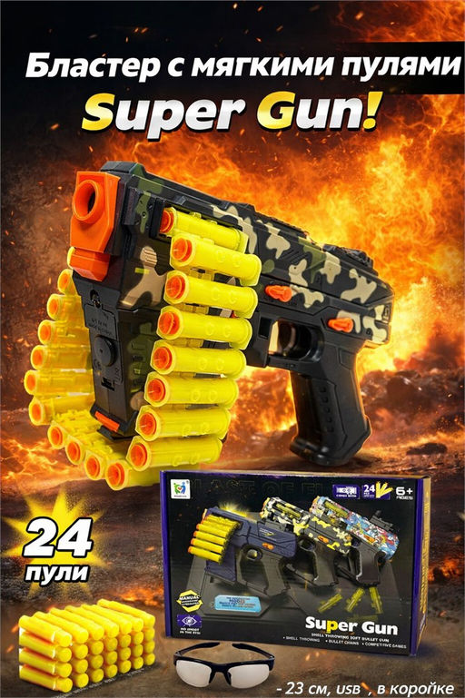 • Стреляющ. мягкими пулями аккумул. 23*17,5см бластер (103B) 24пули в гильзах из ABC-пласт., очки, USB; бегущие огни, выброс гильз, контроль патрона