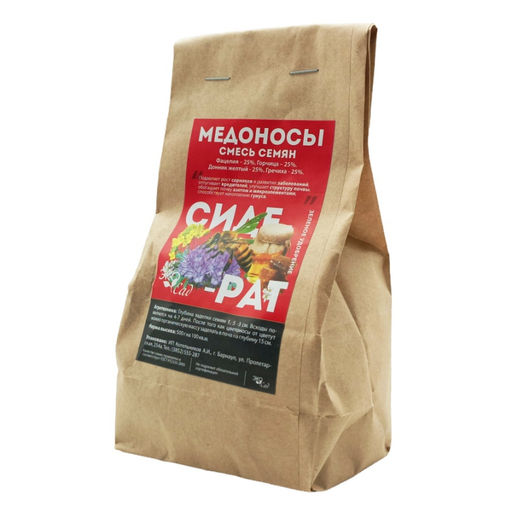 Состав: донник - 25%, гречиха -25%, фацелия -2 5%, горчица -25%. Медоносы  источник нектара и пыльцы для выработки меда пчелами. Это прекрасные растения для органического земледелия. Цветение продолжается несколько месяцев, активно привлекая пчел, бабочек и других полезных насекомых. Культуры, входящие в состав смеси, образуют сочную зеленую массу,богатую азотом и микроэлементами, что позволяет использовать смесь в качестве сидерата. Медопродуктивность данной смеси достигает 350кг/га.