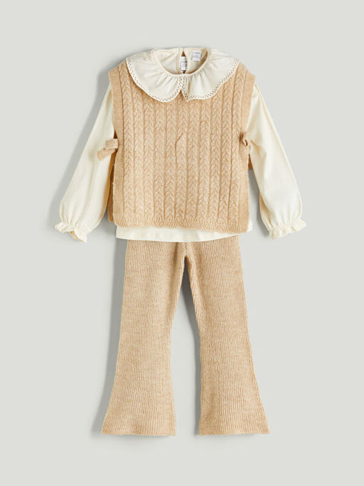 K?z ?ocuk Bebe Yaka Bluz, Triko S?veter ve Pantolon Tak?m