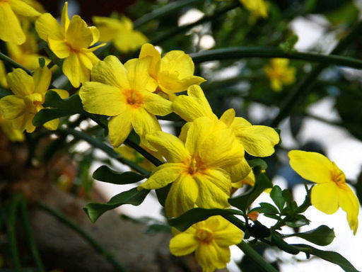 Золотым огнём озарится куст жасмина голоцветкового уже в начале марта. Вы не увидите зелёной листвы на нём, это не связано с обилием цветков, её попросту нет. Появится листва уже после того, как отойдёт цветение и не покинет куст вплоть до холодов. Если Вы житель южных регионов с более мягким зимним климатом, то цветение может навестить Ваш сад уже в феврале. Цветки простой формы небольшие в диаметре по 2-2,5 см. Практически полностью покрывают побеги сверху до низу.