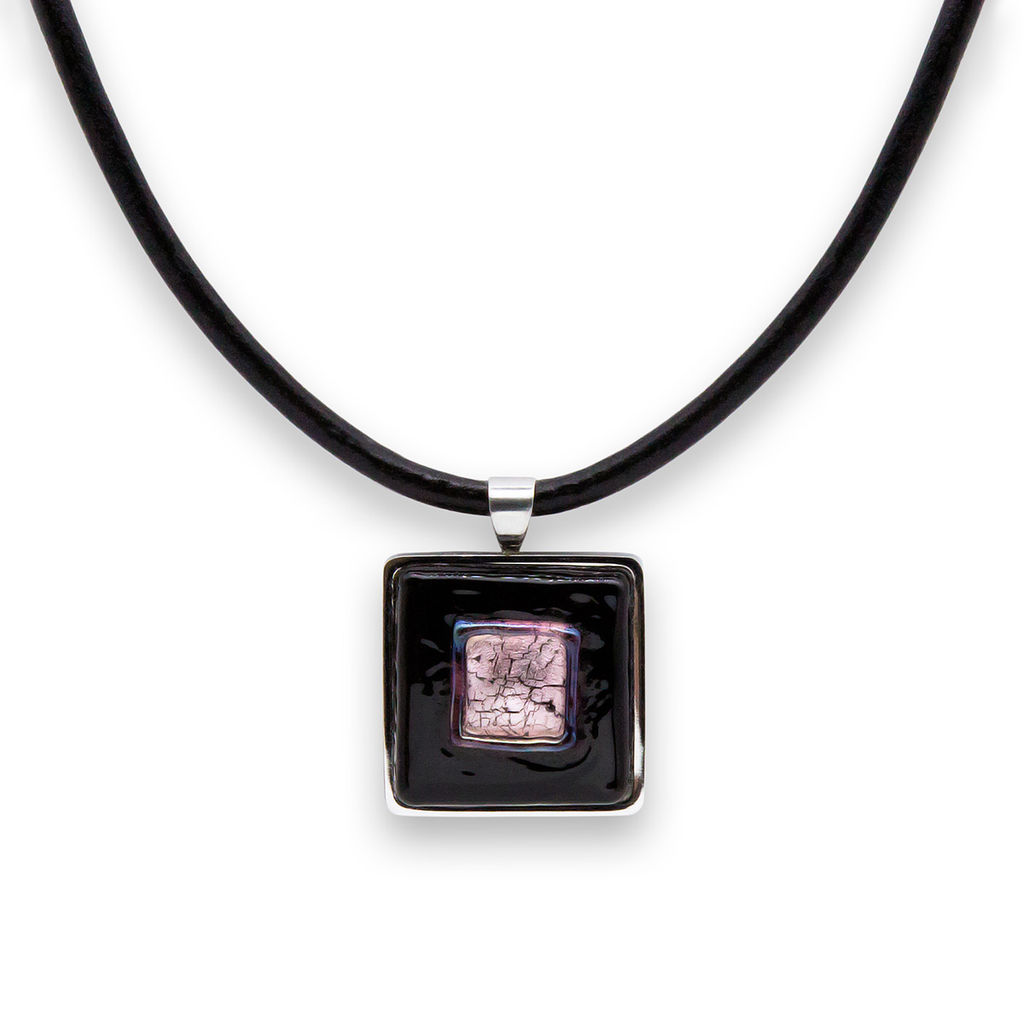 Колье изготовлено из натуральной кожи, муранского стекла и гипоаллергенной ювелирной стали, что очень важно для людей с чувствительной кожей. Металл не темнеет и не подвергается воздействиям окружающей среды, надолго обеспечивая красивый внешний вид изделия. Длина колье - 46 см + 5 см. удлиняющая цепочка. Размер стеклянного элемента - 2,2х2,2 см.  Вес - 18 гр.­