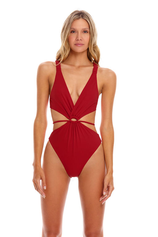 Слитный купальник с центральным кольцом и ремешком, охватывающим талию. Выполнен из люксовой ткани с тактильным эффектом гладкого и легкого шелка, которая быстро сохнет и сохраняет цвет.­
