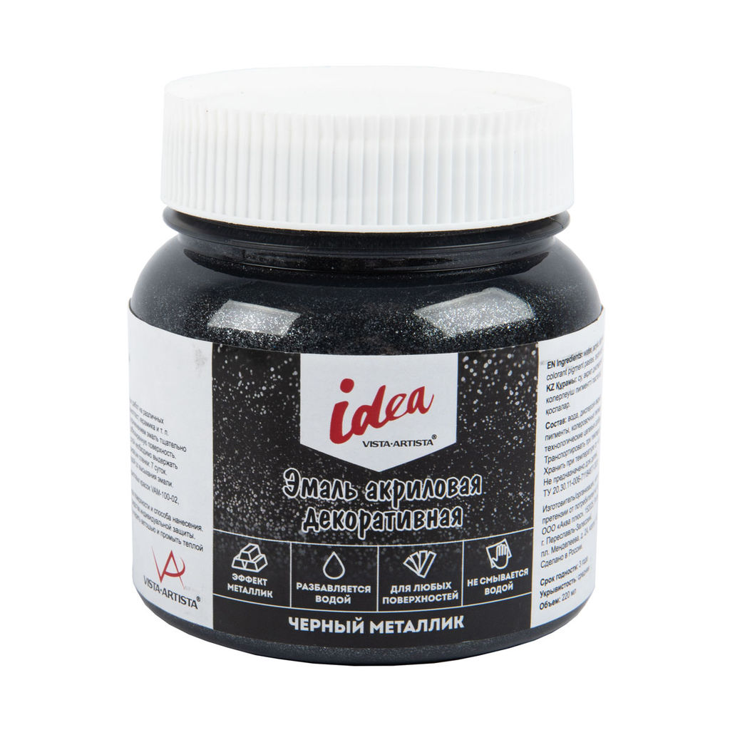 Описание товара Описание Эмаль акриловая VISTA-ARTISTA idea создает декоративное покрытие с металлическим и перламутровым блеском. Палитра эмалей включает в себя 6 цветов: 001 под золото 002 под серебро 003 под бронзу 004 под медь 005 под жемчуг белый 006 черный металлик Эмаль акриловая VISTA-ARTISTA idea применяется для: - декоративно-прикладных работ, - декора предметов интерьера, - для внутренних работ. Подходящие поверхности для декорирования: дерево, фанера, бумага, картон, ДВП, ДСП, грунтованный холст, ткани, стекло, пластмассы, грунтованный металл, бетон, кирпич, гипс, природный камень, штукатурка. Укрывистость: средняя. Способ применения: Перед применением рабочую поверхность необходимо очистить, обезжирить, высушить. Эмаль акриловую VISTA-ARTISTA idea можно наносить валиком, кистью, губкой. Если нужно нанести еще один слой, первый слой необходимо выдержать не менее 2 часов. Время полной полимеризации пленки - 7 суток. Рабочие инструменты и емкости легко отмываются водой до высыхания эмали. Свойства: -Эффект металлик или перламутр . Разбавляется водой, разбавителем для акриловых красок VAM-100-02 , но не более 5% от объема эмали. После высыхания покрытие устойчивое к воде. Температура применения: выше 15С. Расход: 7-10 м2/ литр в зависимости от типа поверхности и способа нанесения Просим обратить внимание, что расход эмали на квадратный метр является ориентировочным и зависит от следующих факторов: подготовки поверхности, способа и толщины нанесения, количества слоев. Хранение: рекомендуется при температуре от +5 до +35 Обязательный
