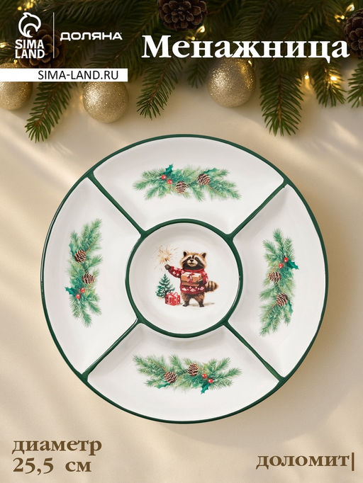 Пятисекционная керамическая менажница «Новогодние животные» — идеальный выбор для праздничного стола. С этой изысканной белой посудой ваши угощения приобретут особую привлекательность. Преимущества изделия Изготовлена из качественного доломита, что обуславливает её долговечность и изысканный внешний вид. Круглая форма с пятью секциями — отличный способ удобно разместить различные закуски, создавая визуально привлекательную подачу. Рисунок на новогоднюю тематику добавляет дополнительное праздничное настроение.Рекомендации по уходуДля сохранения внешнего вида рекомендуется избегать мытья в посудомоечной машине — лучше использовать ручное мытье.Планируете разнообразить сервировку и добавить немного волшебства на свой стол? Эта практичная и привлекательная менажница станет выразительным акцентом в новогоднем декоре вашей кухни! Набор: Нет. Количество ячеек: 5. Тематика: Сказочные животные. Тематика: Новогодняя. Рисунок: Да. Тематика праздника: Новый год. Можно мыть в посудомоечной машине: Нет. Бесплатная доставка: Да. Размеры товара: 25.5/3.1/25.5. Примечание: Оттенок данного товара может незначительно отличаться от фото/видеоизображения (в зависимости от настроек яркости вашего экрана)..
