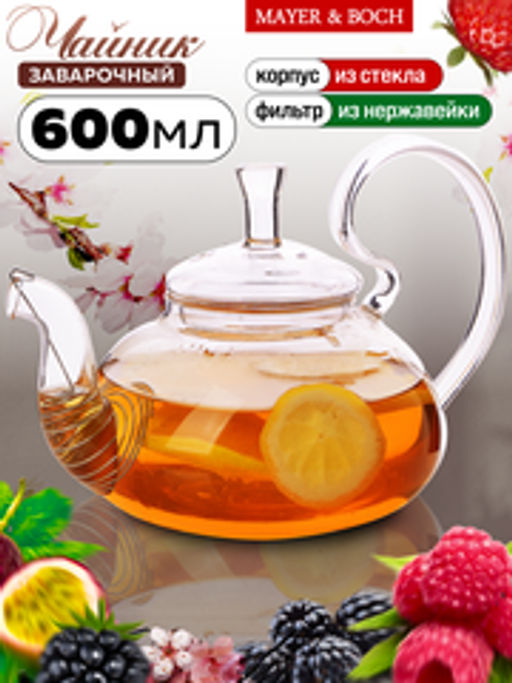 Заварочный чайник MAYER&BOCH станет для вас отличным помощником в заваривании ароматного и по-настоящему вкусного чая. Изготовлен из термостойкого боросиликатного стекла, а металлический фильтр-пружинка из нержавеющей стали. Изделия из стекла не впитывают запахи, благодаря чему вы всегда получите натуральный, насыщенный вкус и аромат напитков. Заварочный чайник выдерживает высокие температуры, обладает стойкостью к царапинам. Благодаря своей эргономичной форме, заварочный чайник с фильтром удобно лежит в руке и обеспечивает комфорт при использовании. Заварник удобно использовать для повседневного заваривания чая практически любого сорта. Цветочные, фруктовые, красные и желтые сорта чая лучше других раскрывают свой вкус и аромат при заваривании именно в стеклянных чайниках, а также сохраняют все полезные ферменты и витамины, содержащиеся в чайных листах. Фильтр-пружина гарантирует прозрачность и чистоту напитка от чайных листьев, при этом сохранив букет и насыщенность чая. Прозрачные стенки дают возможность насладиться насыщенным цветом заваренного чая. Эстетичный и функциональный, с современным дизайном, заварной чайник будет прекрасно смотреться в любом интерьере. Подходит для мытья в посудомоечной машине. Наш стеклянный заварник хочется поставить в центр стола и позвать всех к столу. Изящный заварочный чайник идеален в подарок любимым на любой праздник!­