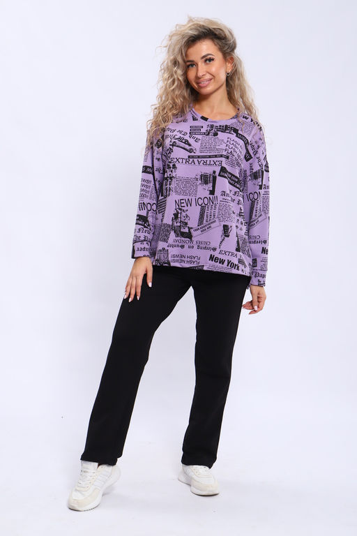 Костюм с брюками и кофтой. Кофта свободного кроя, с разрезами в боковых швах. Спинка удлиненная. Брюки прямого кроя с карманами.