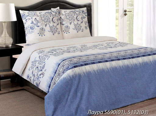 Размер общий: Евро Артикул: 41262/0-БЧ Тип ткани: Бязь Состав: 100% Хлопок Вид оформления: Набивная (С рисунком) Пододеяльник, см: 225*215 Простыня, см: 240*220 Рисунок: 569001/511203 К Лаура Применение: Спальня Производитель: Беларусь Характер рисунка: Орнамент, Растительный Оттенок цвета: Белый , Оттенки синего Упаковка: пакет пвх Тип простыни: без резинки Комплектация: Наволочки 2шт, Пододеяльник 1шт, Простыня 1шт Тип изделия: Комплект постельного белья Наволочка, см: 50*70 - 2 шт Плотность, г/м?: 125