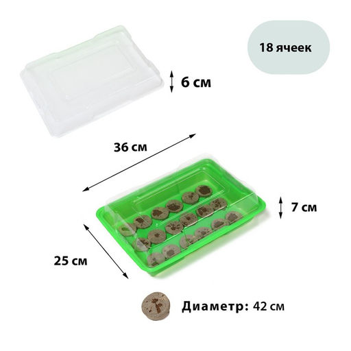 • Мини - парник для рассады: торфяная таблетка d=4.2 см (18 шт.), парник 36×25 см, зелёный